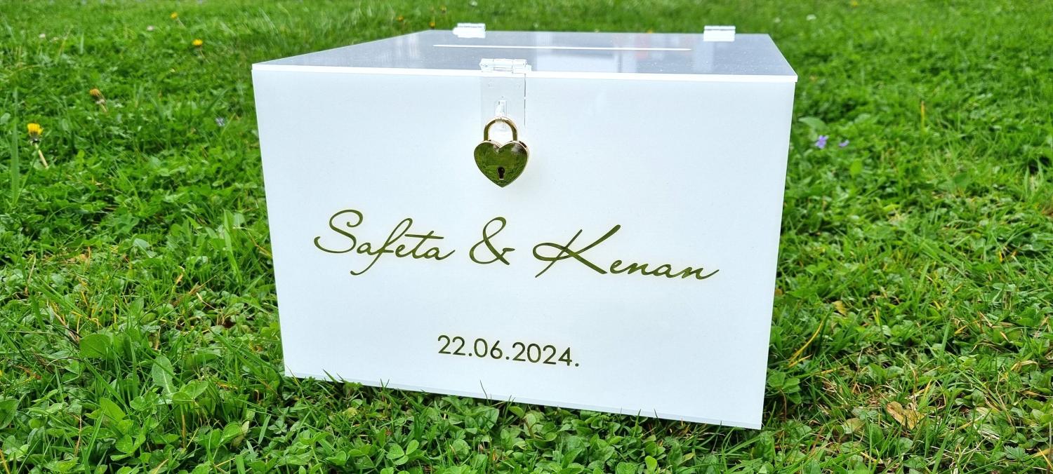 Kutija je izrađena od mutnog akrila, boje leda, dodatno ukrašena natpisom po želji.