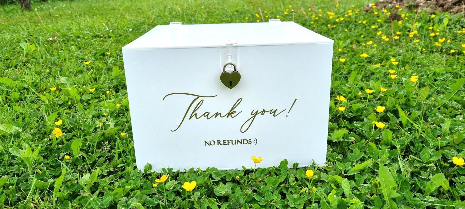 Kutija je izrađena od bijelog akrila, dodatno ukrašena natpisom po želji.