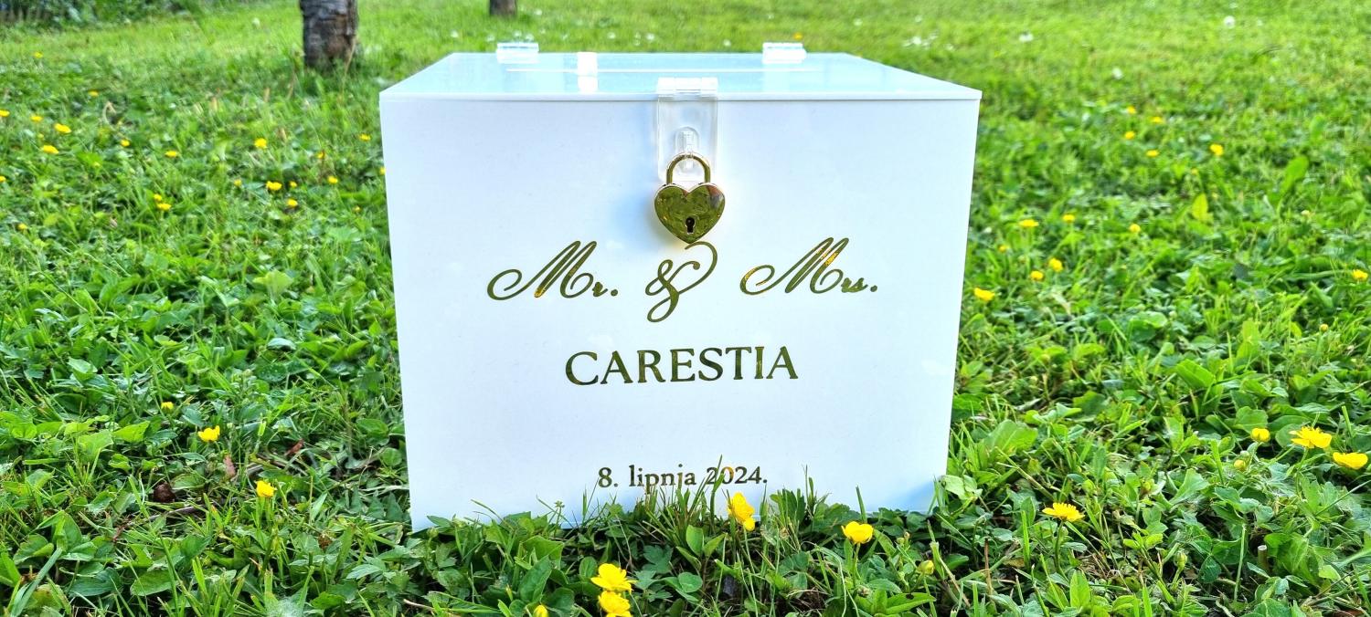 Model 43 Cijena: 60,00€ Dimenzija kutije: 25x25x20 cm Kutija je izrađena od bijelog akrila, dodatno ukrašena natpisom po želji. Kutija je dovoljna za cca 100 kuverti. Mogućnost izmjene teksta i veličine kutije. Za sve izmjene cijena na upit.