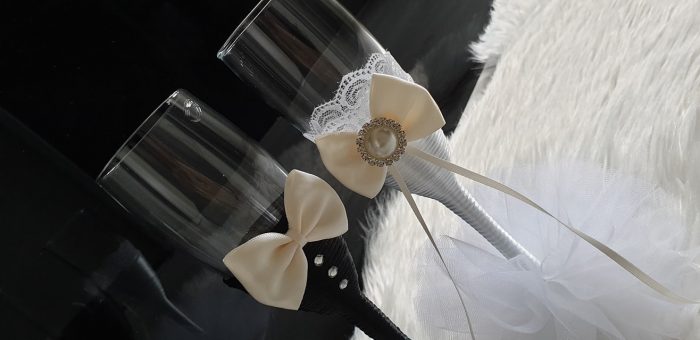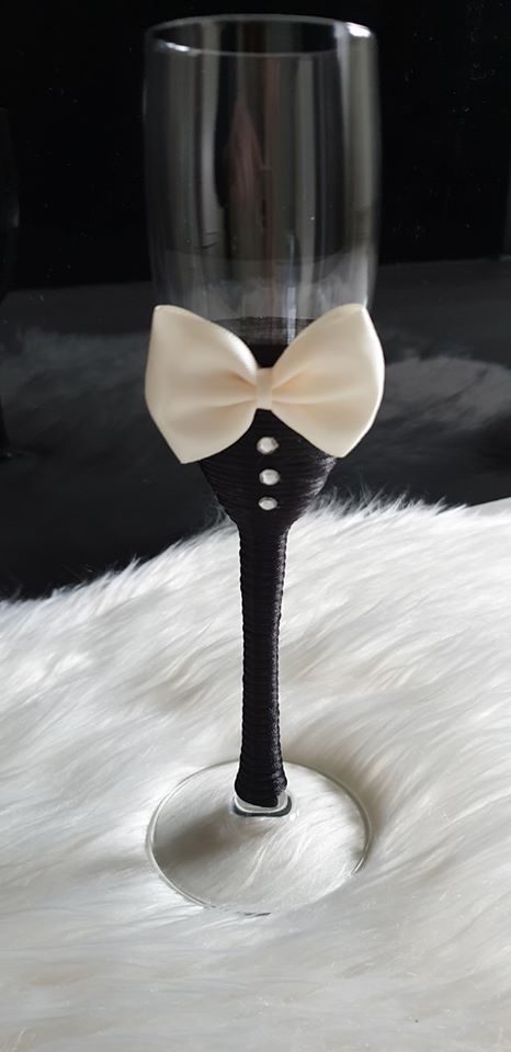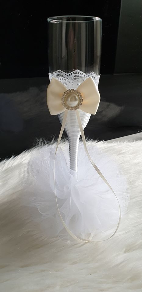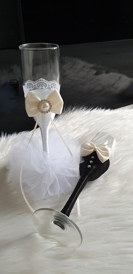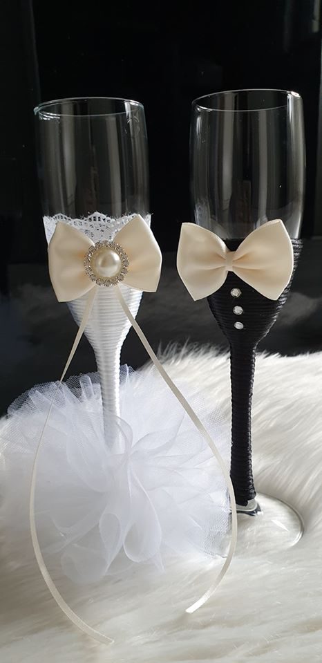 Model 12 Cijena kompleta: 18,00€ Čaše su ručno ukrašene kvalitetnim satenskim konopom te dekorirane satenskom mašnom, čipkom, cirkonima, tilom i ukrasnim brošem. Cijena se odnosi na komplet od dvije čaše. Mogućnost promjene boja i dekoracija po želji – cijena na upit.