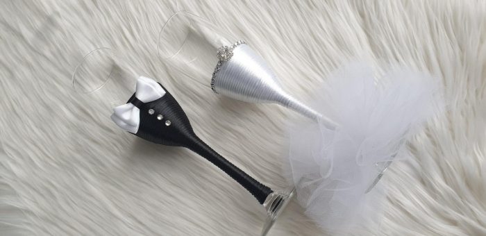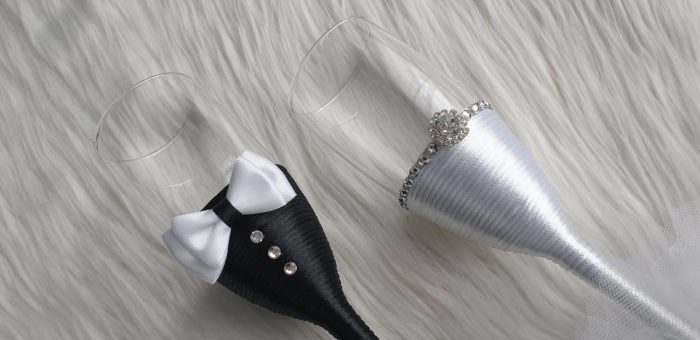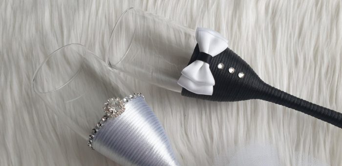 Model 28 Cijena kompleta: 18,00€ Čaše su ručno ukrašene kvalitetnim satenskim konopom te dekorirane satenskom mašnom, cirkonima, tilom i ukrasnim brošem. Cijena se odnosi na komplet od dvije čaše. Mogućnost promjene boja i dekoracija po želji – cijena na upit.