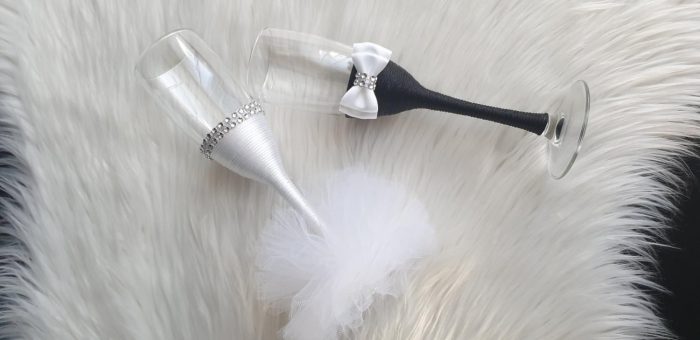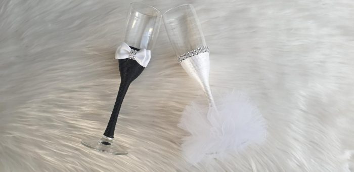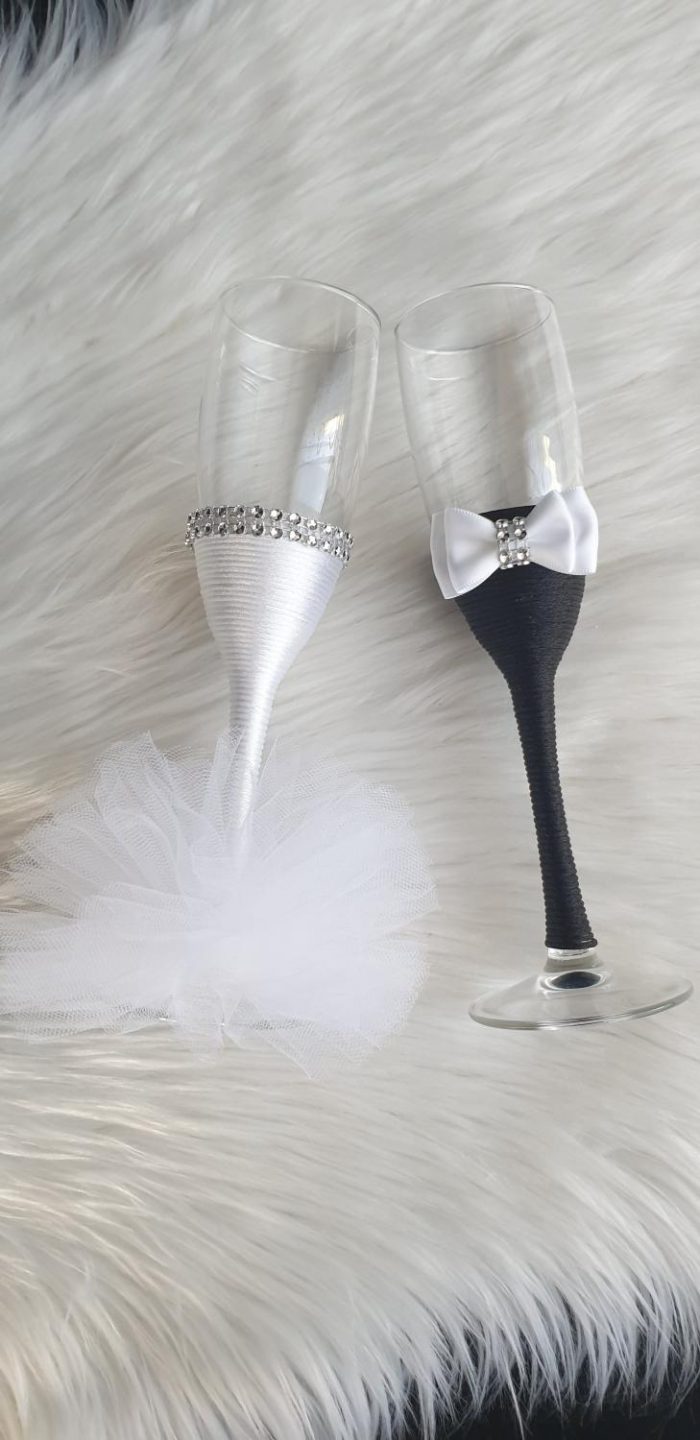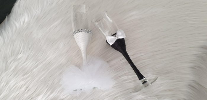 Model 3 Cijena kompleta: 18,00€ Čaše su ručno ukrašene kvalitetnim satenskim konopom te dekorirane satenskom mašnom, čipkom, cirkon trakom i tilom. Cijena se odnosi na komplet od dvije čaše. Mogućnost promjene boja i dekoracija po želji – cijena na upit.