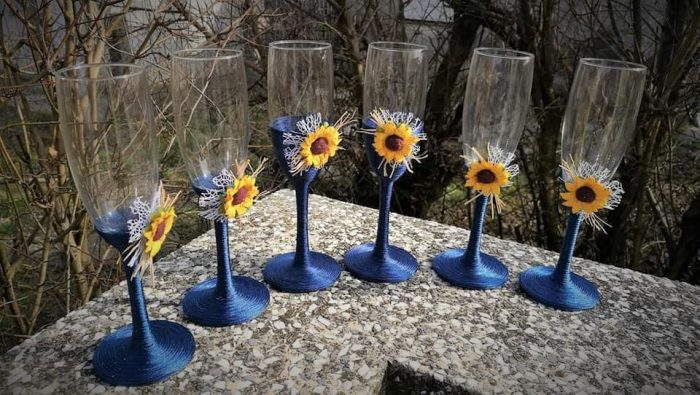 Model 33 Cijena kompleta: 54,00€ Čaše su ručno ukrašene kvalitetnim satenskim konopom te dekorirane ukrasnim cvijetom. Cijena se odnosi na komplet od 6 čaša (čaše za mladence i kumove). Mogućnost promjene boja i dekoracija po želji – cijena na upit.