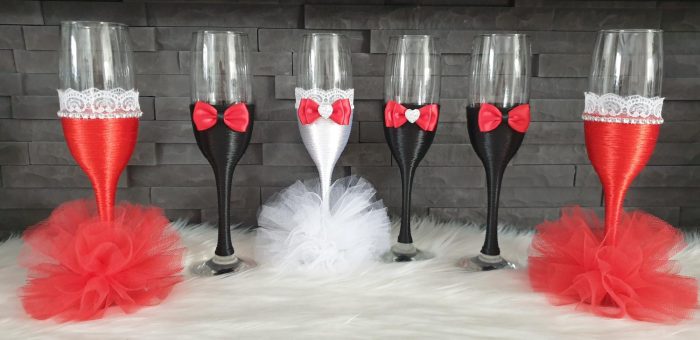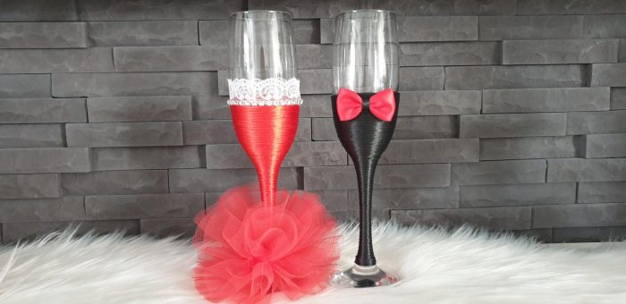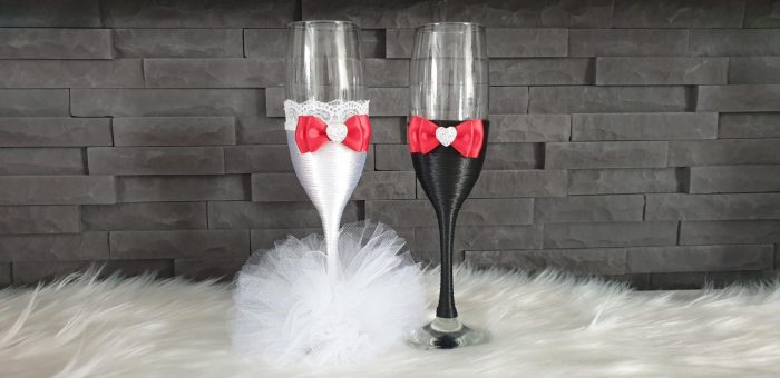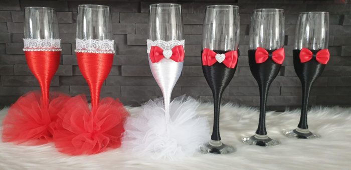 Model 35 Cijena kompleta: 54,00€ Čaše su ručno ukrašene kvalitetnim satenskim konopom te dekorirane satenskom mašnom, čipkom, cirkonima, tilom i ukrasnim cirkon srcem. Cijena se odnosi na komplet od 6 čaša (čaše za mladence i kumove). Mogućnost promjene boja i dekoracija po želji – cijena na upit.