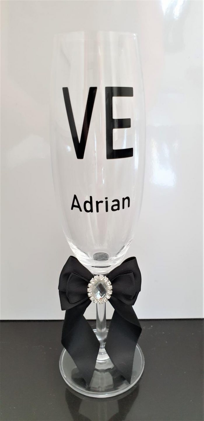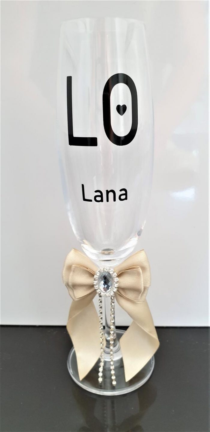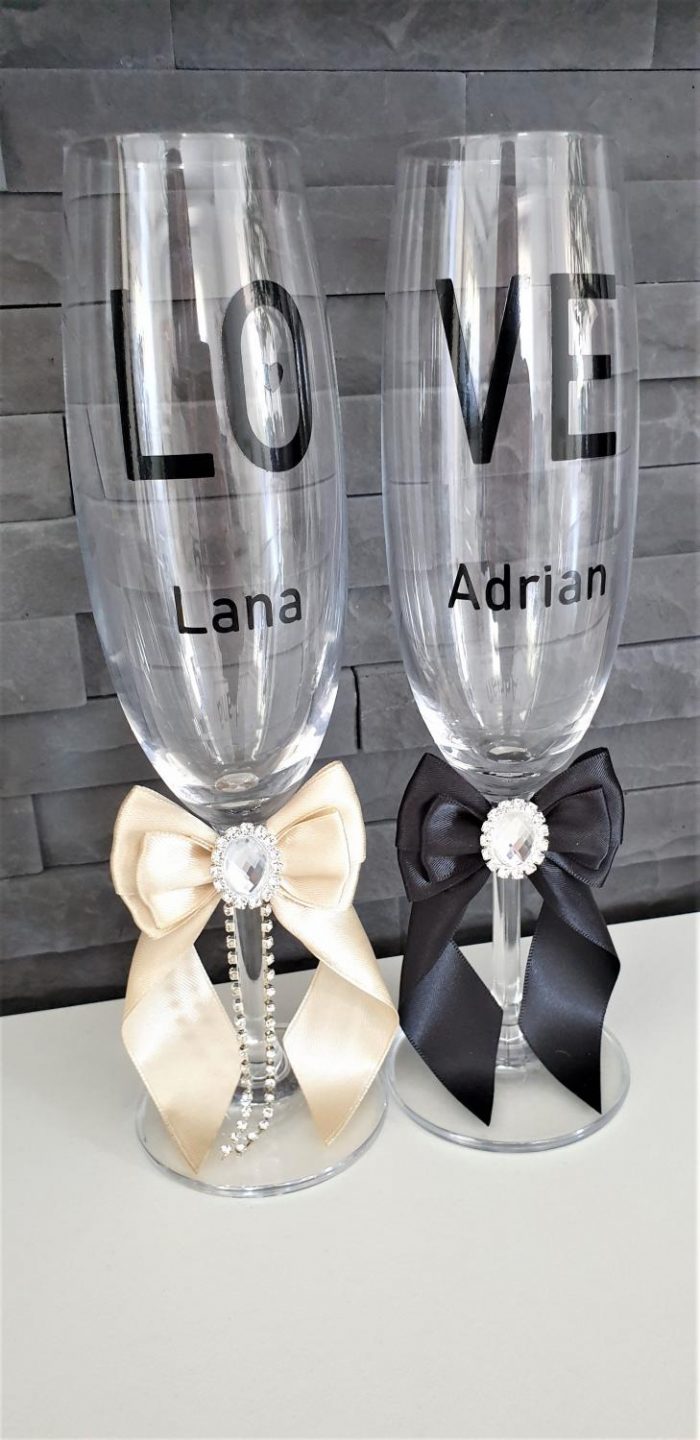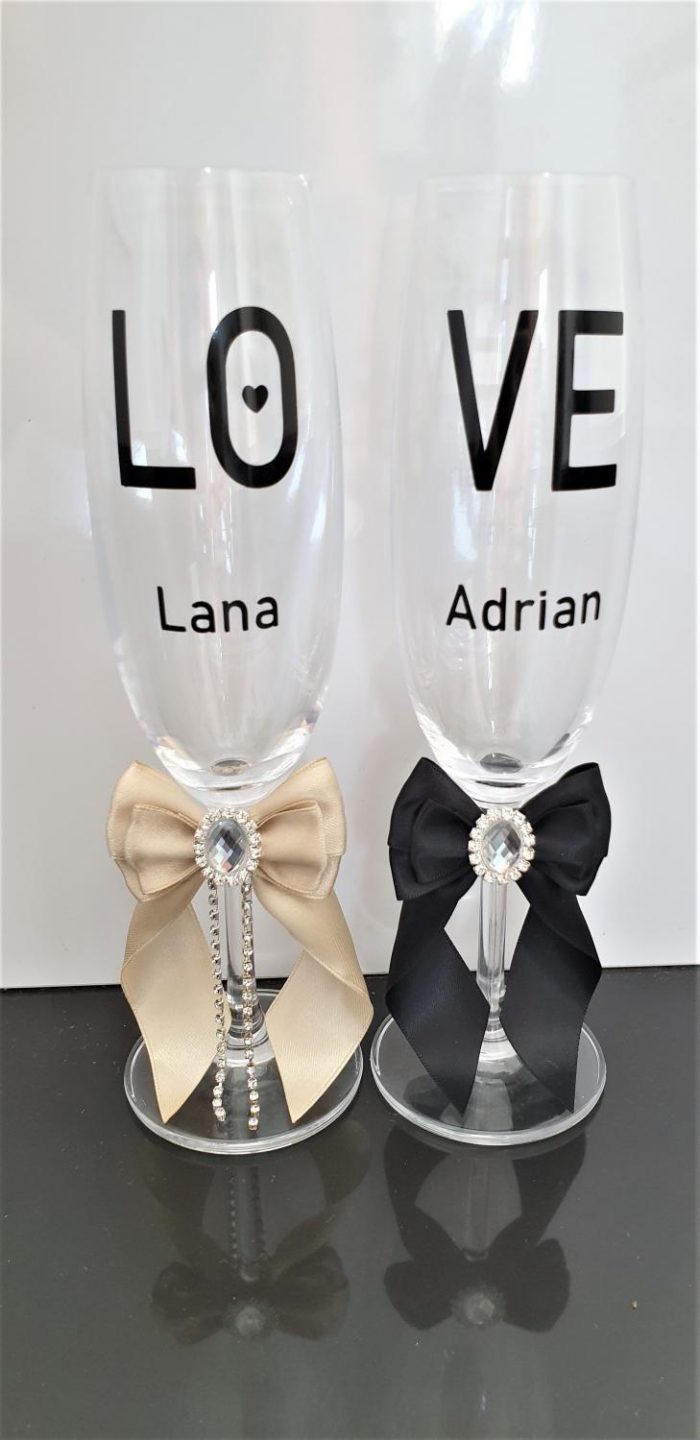Model 48 Cijena kompleta: 15,00€ Čaše su ručno ukrašene kvalitetnom satenskom trakom i mašnom, te dodatno dekorirane cirkonskim brošem. Tekst na čaši prema želji. Cijena se odnosi na komplet od dvije čaše. Mogućnost promjene boja i dekoracija po želji – cijena na upit.