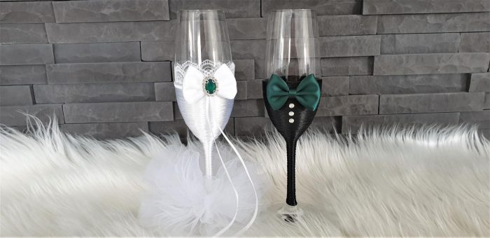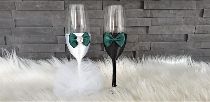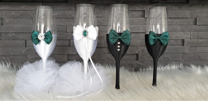 Model 49 Cijena kompleta: 36,00€ Čaše su ručno ukrašene kvalitetnim satenskim konopom te dekorirane satenskom mašnom, tilom, cirkonima i ukrasnim brošem. Cijena se odnosi na komplet od 4 čaše. Mogućnost promjene boja i dekoracija po želji – cijena na upit.