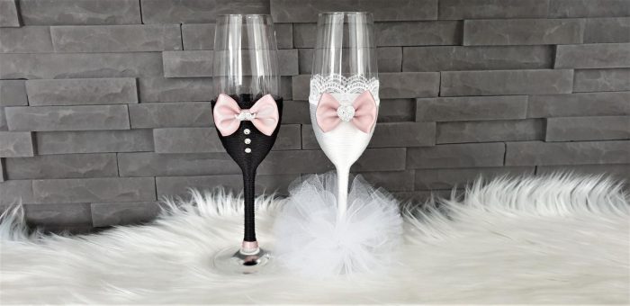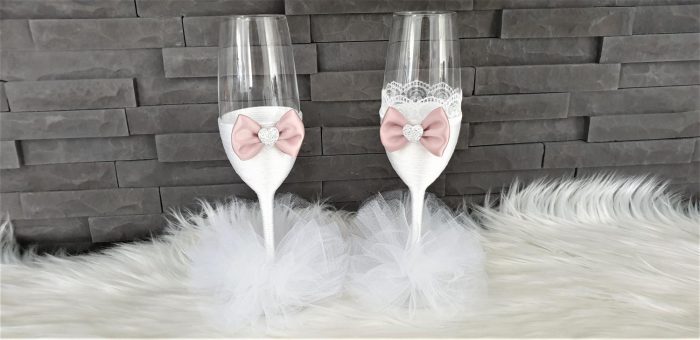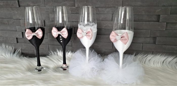 Model 50 Cijena kompleta: 36,00€ Čaše su ručno ukrašene kvalitetnim satenskim konopom te dekorirane satenskom mašnom, čipkom, tilom, cirkonima, ukrasnim brkovima i srcima. Cijena se odnosi na komplet od 4 čaše. Mogućnost promjene boja i dekoracija po želji – cijena na upit.