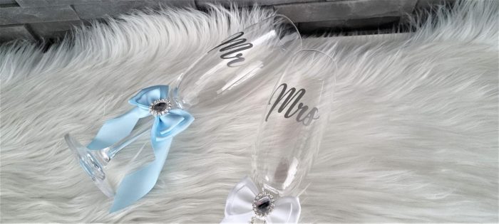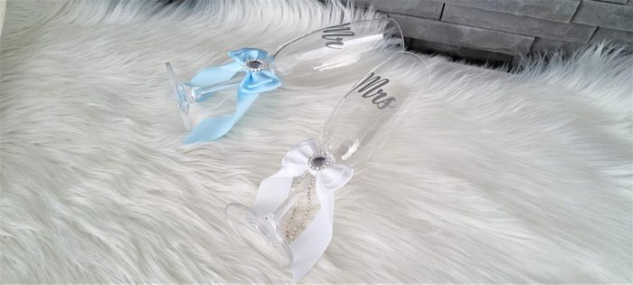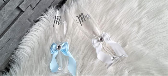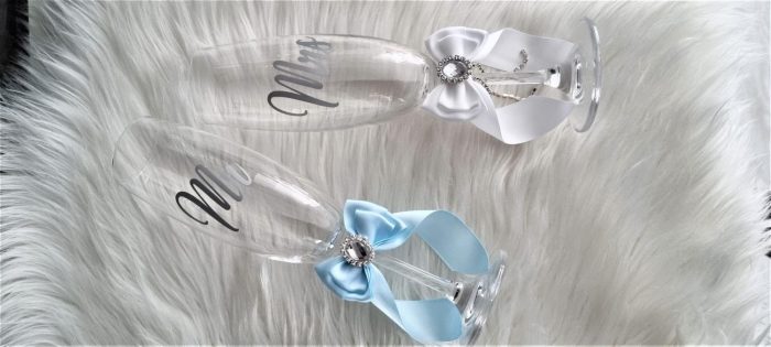 Model 53 Cijena kompleta: 15,00€ Čaše su ručno ukrašene kvalitetnom satenskom trakom i mašnom, te dodatno dekorirane cirkonskim brošem. Cijena se odnosi na komplet od dvije čaše. Mogućnost promjene boja i dekoracija po želji – cijena na upit.