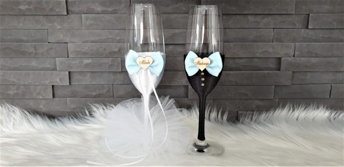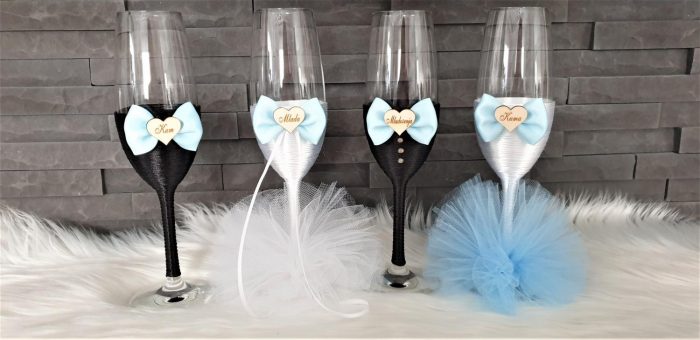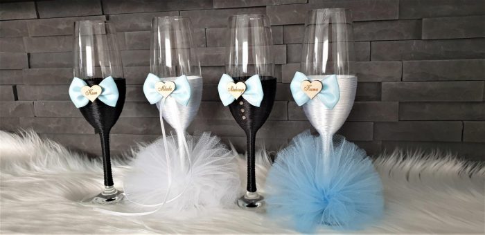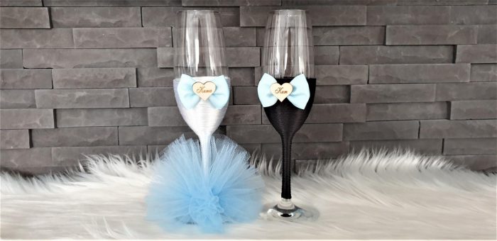 Čaše su ručno ukrašene kvalitetnim satenskim konopom te dekorirane satenskom mašnom, tilom, cirkonima i graviranim drvenim srcima sa natpisom po želji.