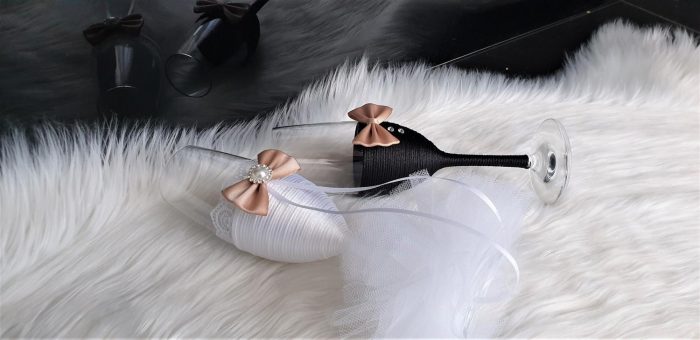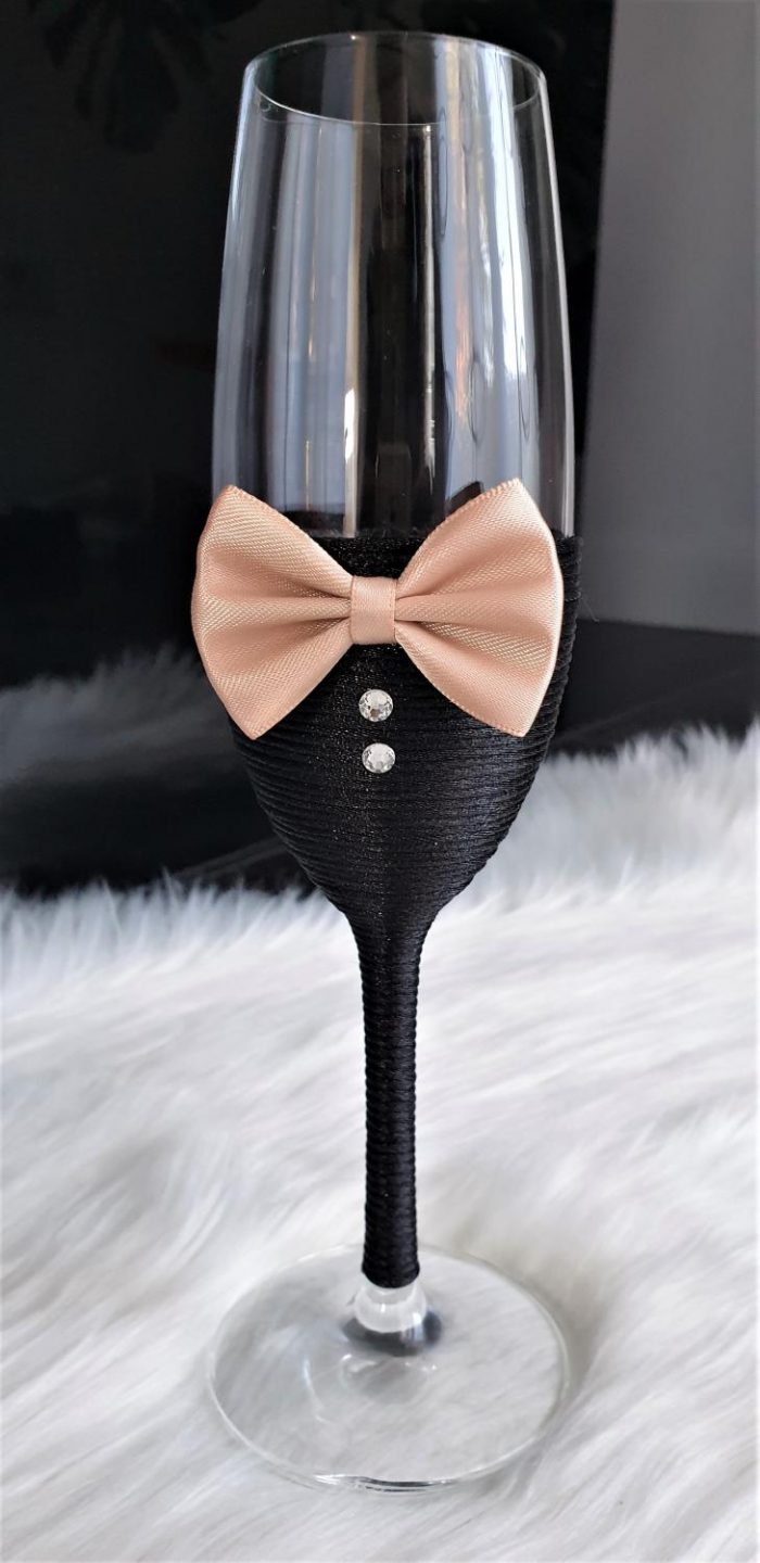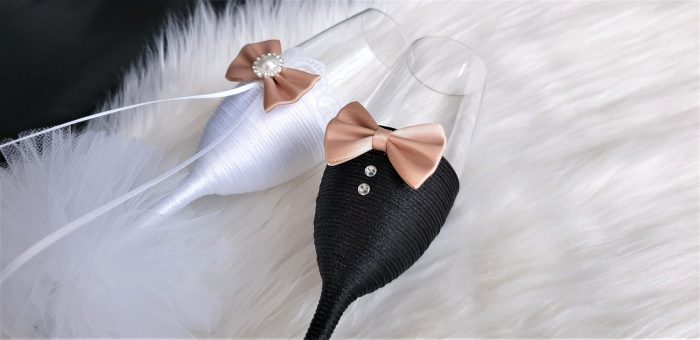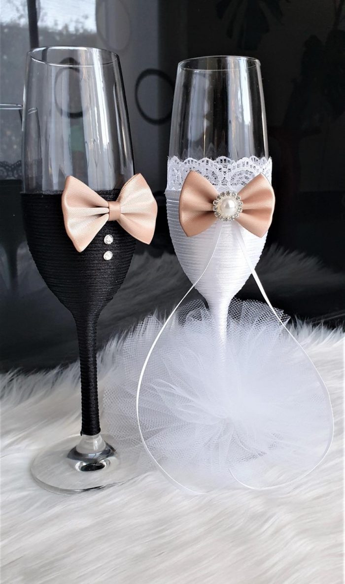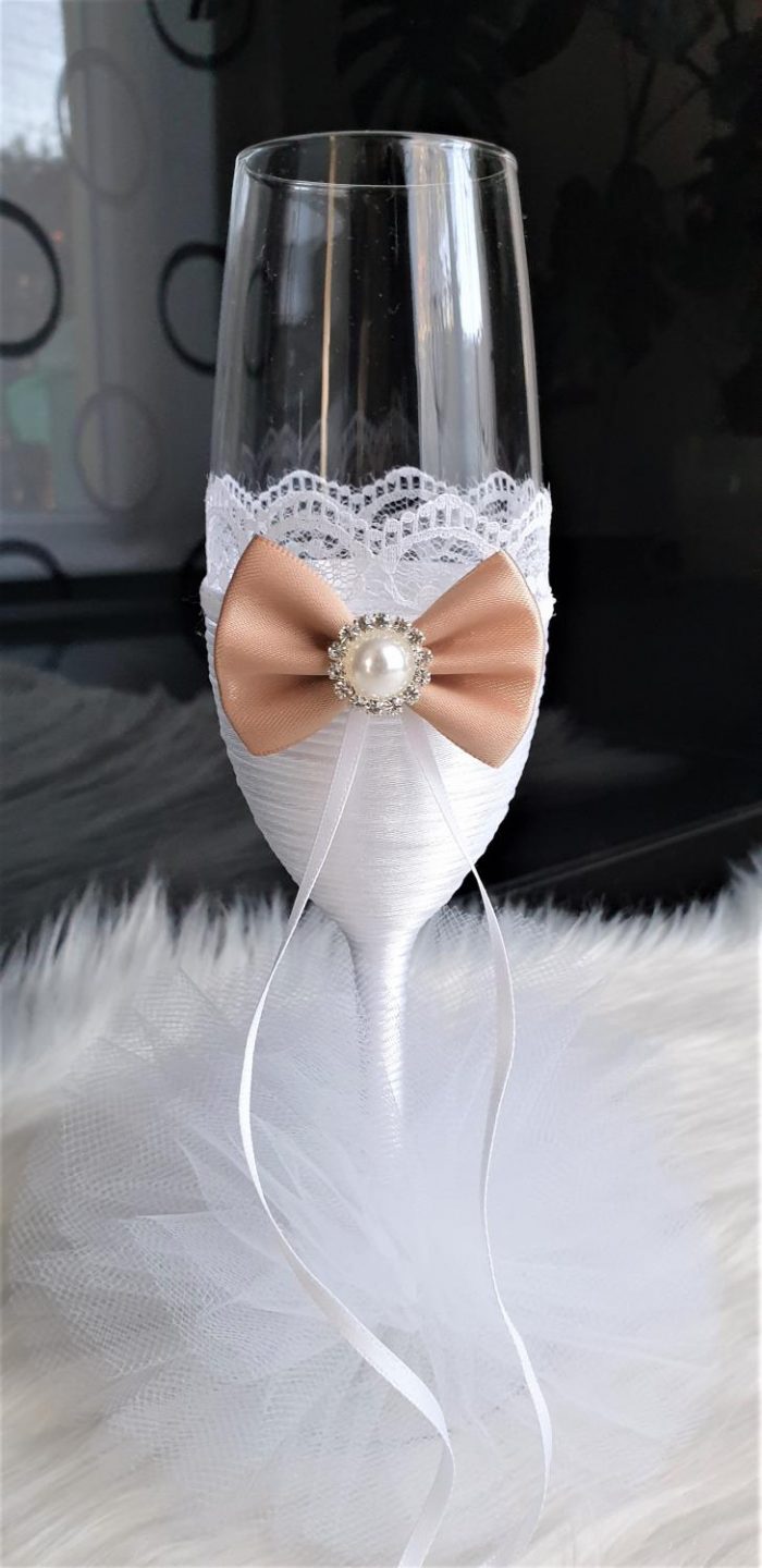 Model 59 Cijena kompleta: 18,00€ Čaše su ručno ukrašene kvalitetnim satenskim konopom te dekorirane satenskom mašnom, čipkom, cirkonima, tilom i ukrasnim brošem. Cijena se odnosi na komplet od dvije čaše. Mogućnost promjene boja i dekoracija po želji – cijena na upit.