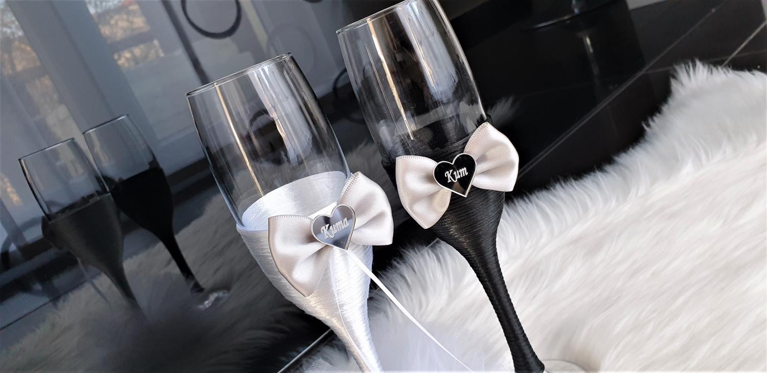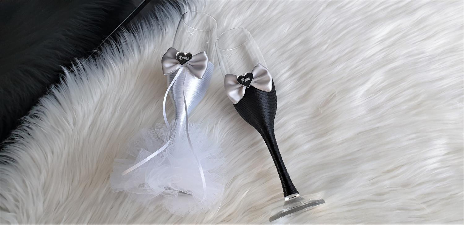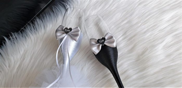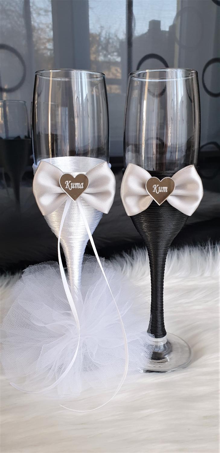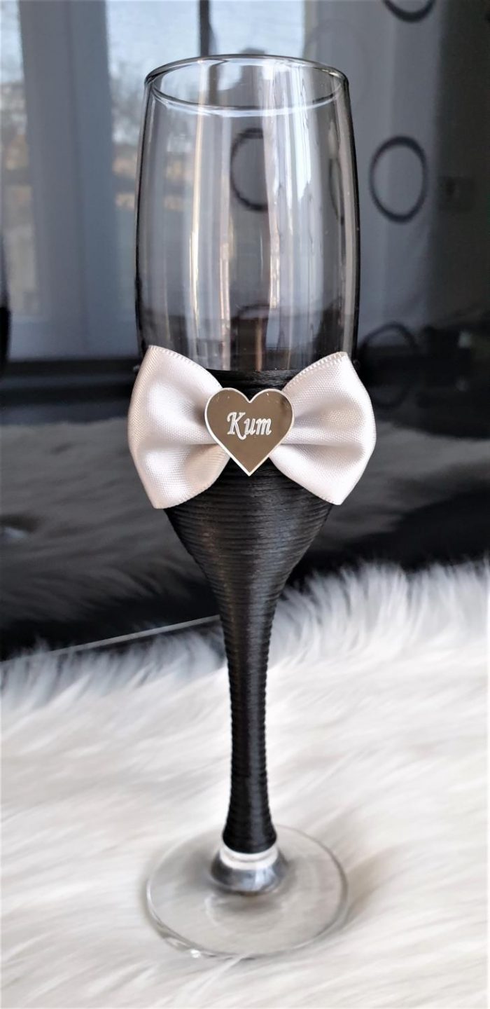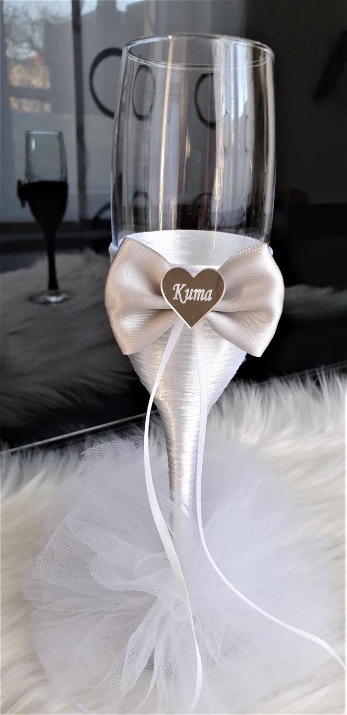 Model 6 Cijena kompleta: 18,00€ Čaše su ručno ukrašene kvalitetnim satenskim konopom te dekorirane satenskom mašnom, tilom i elegantnim zrcalnim akrilnim srcima sa natpisom po želji. Cijena se odnosi na komplet od dvije čaše. Mogućnost promjene boja i dekoracija po želji – cijena na upit.